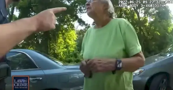 「キャットレディ」ことビバリー・ロバーツさんは、2022年に逮捕された際の警察の映像に映っている。ロバーツさんは友人で猫好き仲間のメアリー・アルストンとともに、この事件を巡りアラバマ州ウェタンプカ市を告訴した。 YouTube のスクリーンショット CrimeSeries。